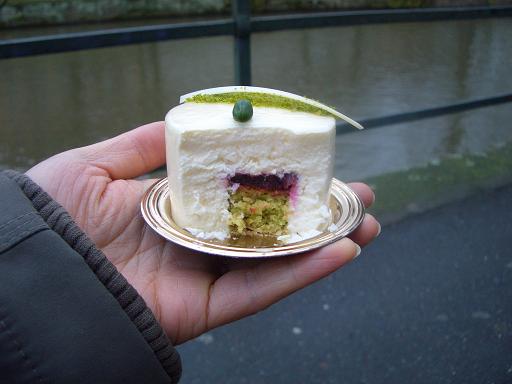 左はピスターシュとレ・ダマンド(アーモンドとミルク味)・・レ・ダマンドの味が良い感じの甘さで中のカシスのジュレとマッチ!!下のピスターシュのビスキュイにはピスターシュの粒が・・・高級?!