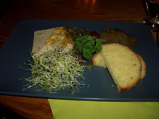 前菜2・・・・フォアグラのテリーヌをオニオンコンフィ、ジュレ、アラルファとともにブリオッシュにのっけていただく