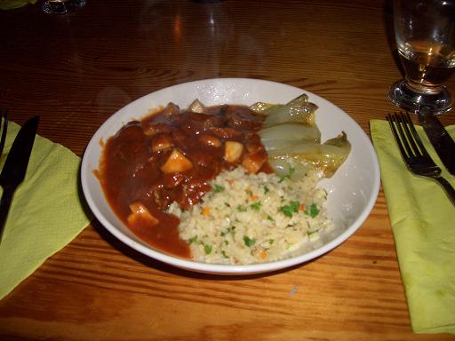 そしてメインは・・・ビーフシチュー、ガーリックライスとシコンのソテーとともに